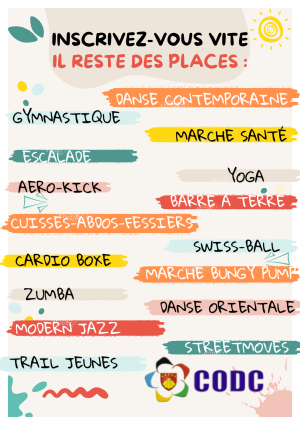 Il reste quelques places dans certaines disciplines, n’hésitez pas à consulter notre site internet pour tous renseignements et inscriptions https://www.sports-cruseilles-codc.com/