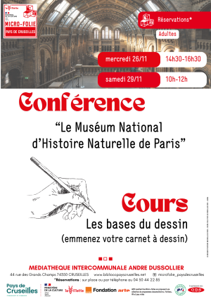 Samedi 20/09 10H-12HNouvelle formule : 1H de conférence, suivie d’un cours d’1H de dessin possibilité de réserver la conférence et / ou le cours ( emmenez votre propre carnet à dessin ).