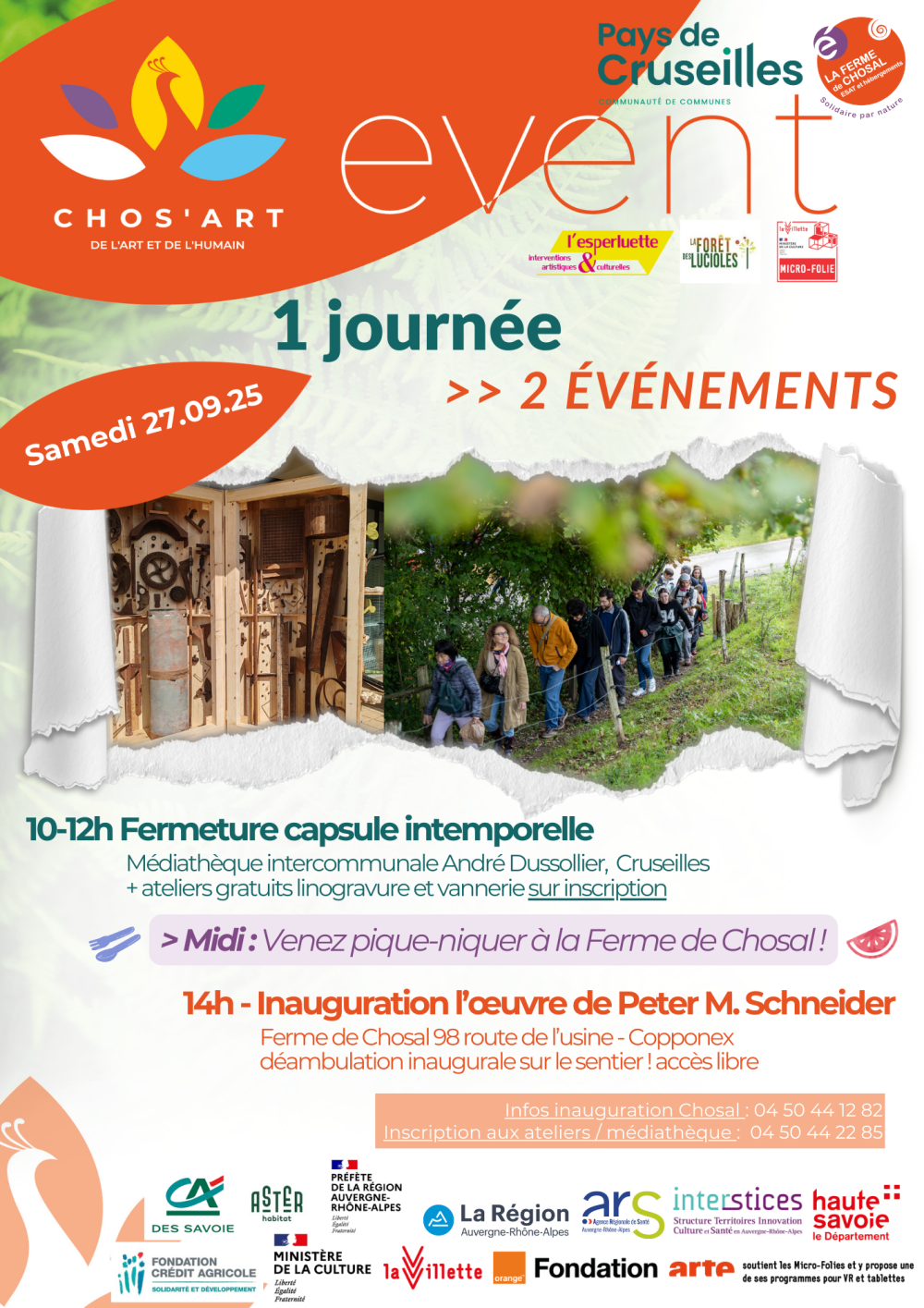 • Fermeture de la capsule intemporelle à la médiathèque à 10h : inauguré en 2025 ce projet est le fruit d’une collaboration entre la Ferme de Chosal, la Médiathèque intercommunale, l’Esperluette et la Foret des Lucioles qui ensemble ont réinvesti une pièce du Moulin de Copponex (cf. https://fermedechosal.org/lesmoulinsdegermain/) pour lui donner une seconde vie. Le 27 septembre sera donc l’occasion pour vous de déposer votre message (si ce n’est pas déjà fait) sur la base du questionnaire disponible sur place, avant de fermer la caspule pour les 25 prochaines années ! en parallèle, deux ateliers sont proposés (gratuitement) au public : linogravure et vannerie (sur inscription).