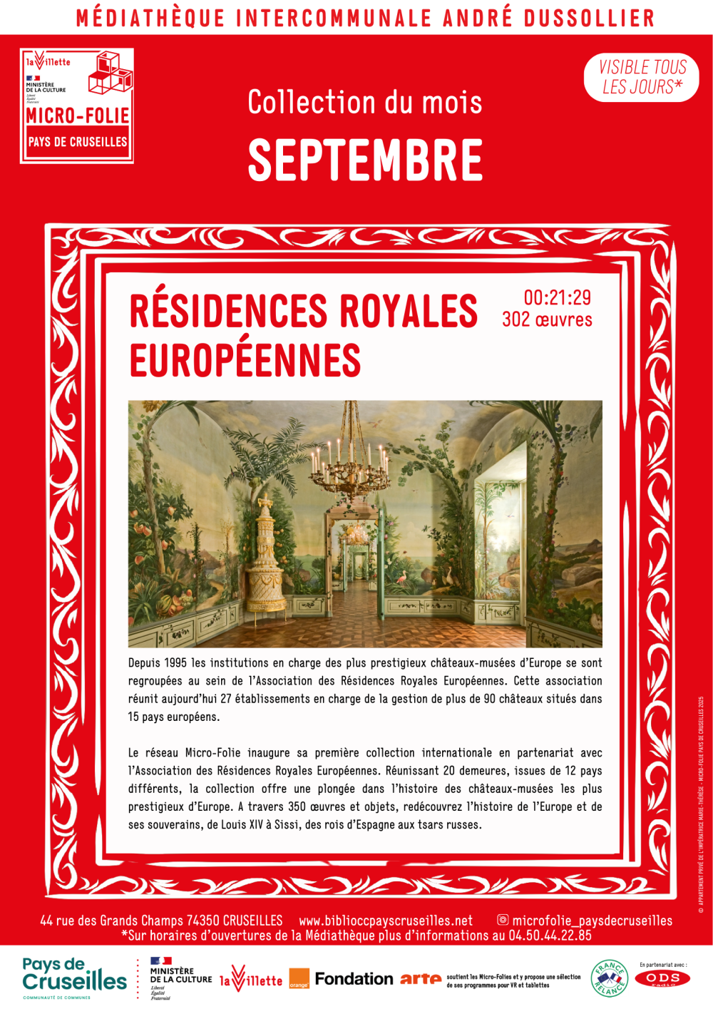Le réseau Micro-Folie inaugure sa première collection internationale en partenariat avec l’Association des Résidences Royales Européennes. Réunissant 20 demeures, issues de 12 pays différents, la collection offre une plongée dans l’histoire des châteaux-musées les plus prestigieux d’Europe. A travers 350 œuvres et objets, redécouvrez l’histoire de l’Europe et de ses souverains, de Louis XIV à Sissi, des rois d’Espagne aux tsars russes.